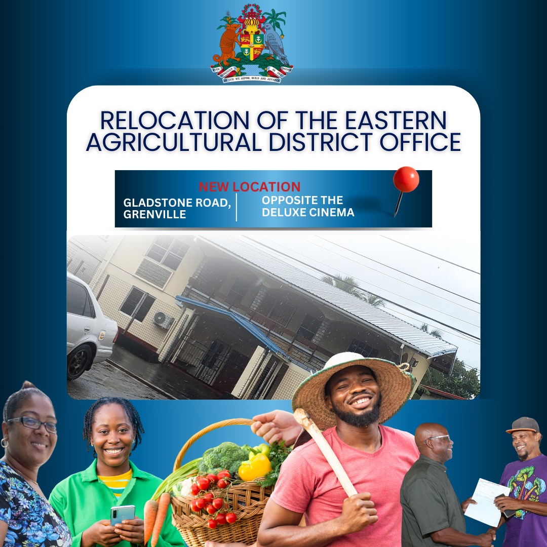 The Ministry of Agriculture and Lands, Forestry and Marine Resources informs the public, of the relocation Eastern Agricultural District Office temporarily from its previous location at Seaton Brown Street to Gladstone Road (Opposite the Deluxe Cinema, Grenville).