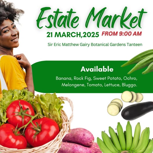 The Ministry of Agriculture and Lands, Forestry, Marine Resources and Cooperatives is pleased to announce another edition of its Estate Market on Friday, March 21, 2025, at the Ministerial Complex, Tanteen, St. George from 9:00 AM.