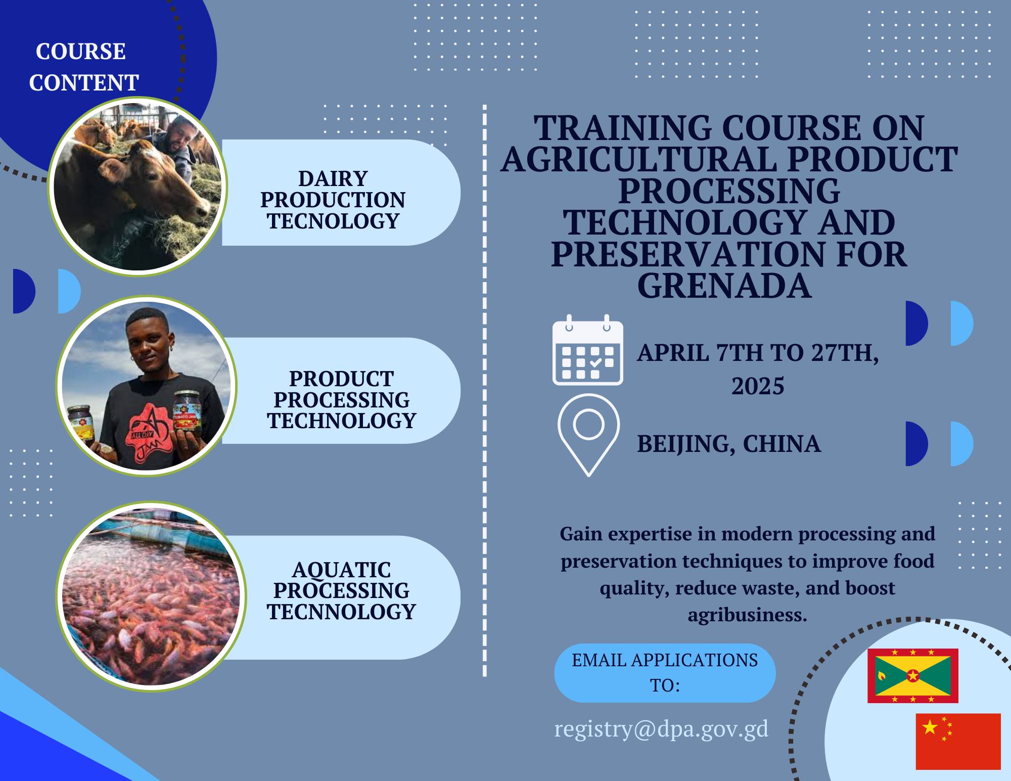 • Agricultural Product Processing Technology and Preservation for Grenada to held in China from April 7 to 27, 2025.